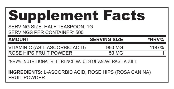 Ízesítetlen C-vitamin por, hozzáadott csipkebogyóval.