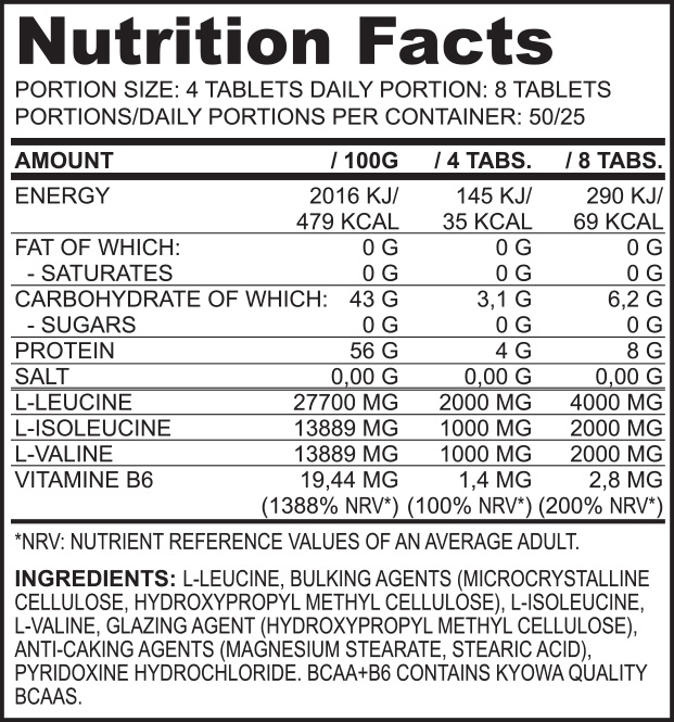 2:1:1 arányú Kyowa BCAA tabletta, B6 vitaminnal kiegészítve.